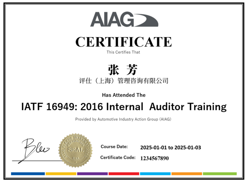 合格的学员可获得AIAG颁发的IATF 16949:2016 内部审核员培训证书。