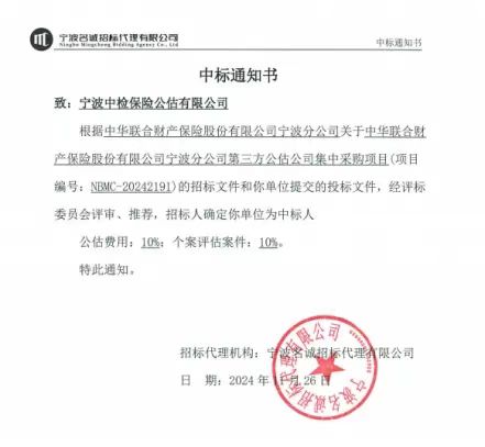 近日中国中检宁波公司下属子公司宁波中检保险公估有限公司顺利中标中华联合财产保险股份有限公司宁波分公司第三方公估集中采购项目(项目编号:NBMC-20242191)。此次中标是该公司今年第四个顺利落地的保险公估合作项目。同时也再次证明了广大客户群体对公估公司在保险公估领域专业能力与市场竞争力的充分认可。