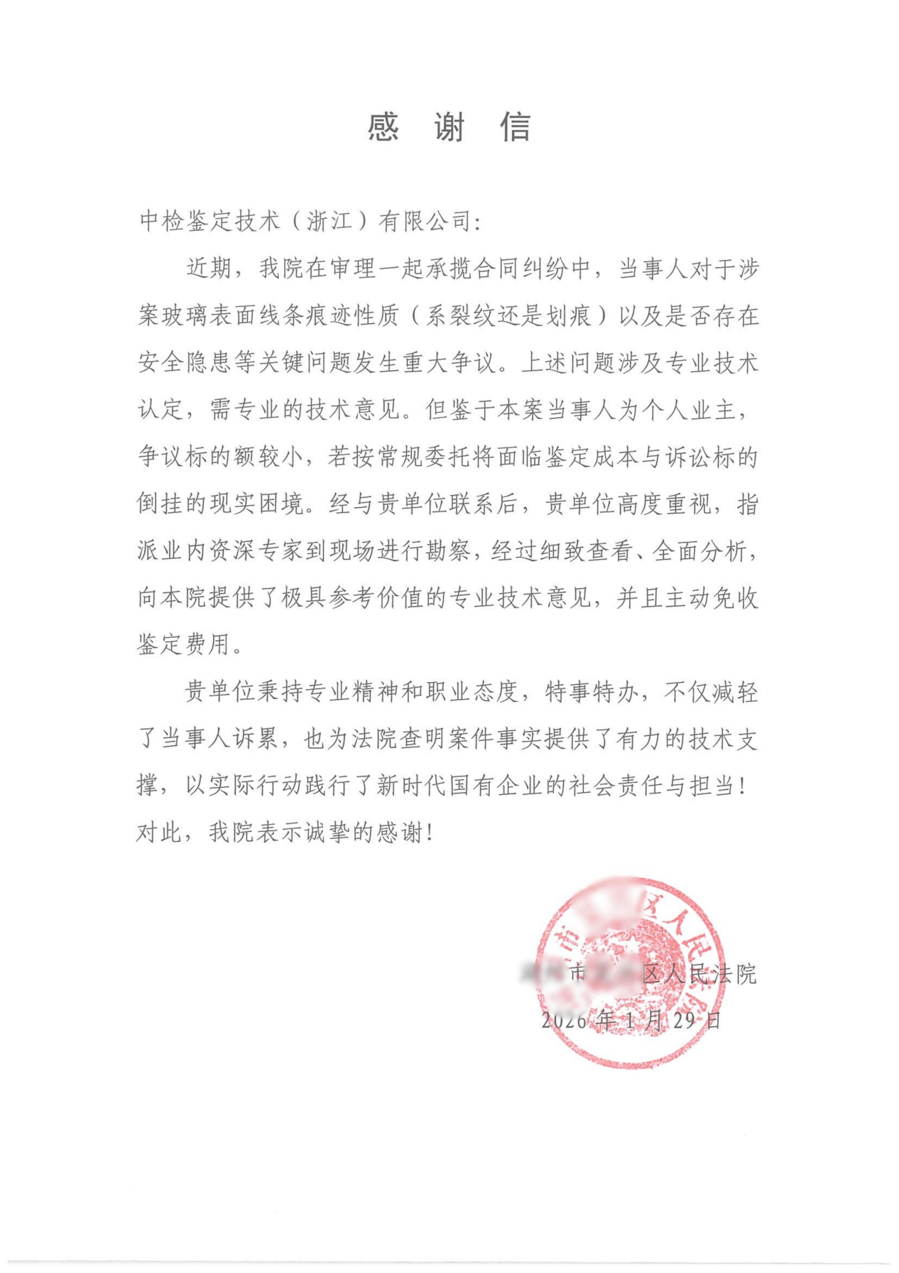 接到委托后,中检鉴定高度重视,迅速组织响应。经审慎研究,公司决定对此案免收鉴定费用,并郑重承诺做到“程序不减、标准不降、范围不缩”,确保以科学、客观、公正的专业意见精准回应司法需求。技术团队恪守职业规范,高效完成了鉴定工作,为法院厘清技术事实提供了关键依据。法院对此专门发来感谢信,充分肯定了中检鉴定在支持司法工作、服务社会发展方面展现的大局意识与专业水平。