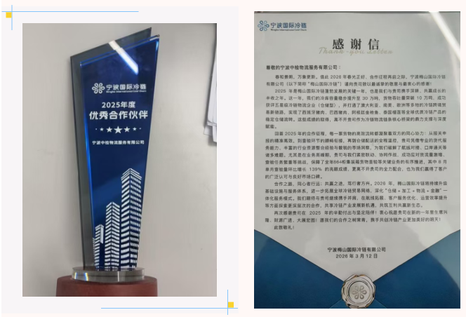 物流板块凭借专业的货代服务与资源整合能力,为合作企业提供报关申报、查验衔接、全程温控仓储配送等一体化支持,高效破解口岸通关、航线对接等行业难题。2025年助力宁波梅山国际冷链完成全年864柜集装箱货物查验,保障其8月单月查验量环比增长139%的业务高峰平稳运行。一季度收到该公司发来的感谢信,并获评其2025年度“优秀合作伙伴”,实现口碑与品牌影响力双提升。