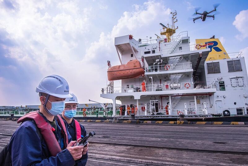 中国中检员工使用无人机对靠泊煤炭散货船舶进行水尺观测