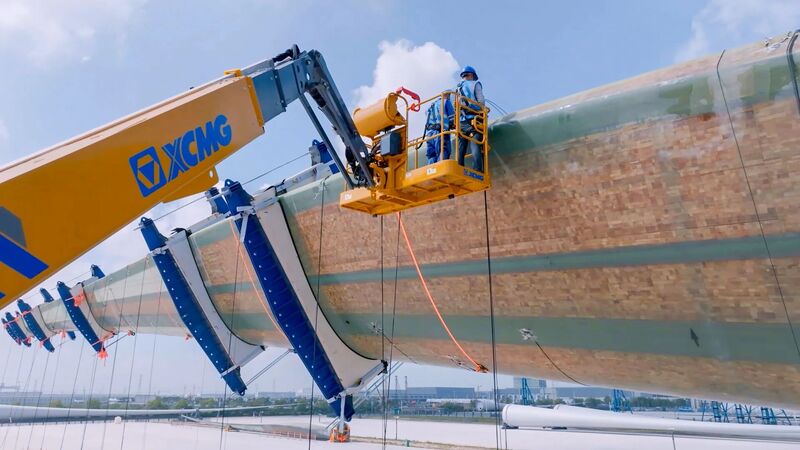 中国质量认证中心射阳新能源创新基地工作人员正在进行风电叶片检测作业