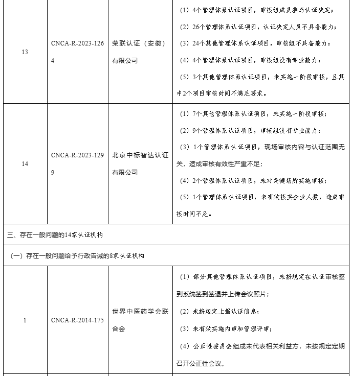 对检查中发现的存在一般问题的14家认证机构,下达行政告诫书或限期整改通知书,要求相关机构对检查中发现的问题立即开展整改,并在规定时间提交整改报告。