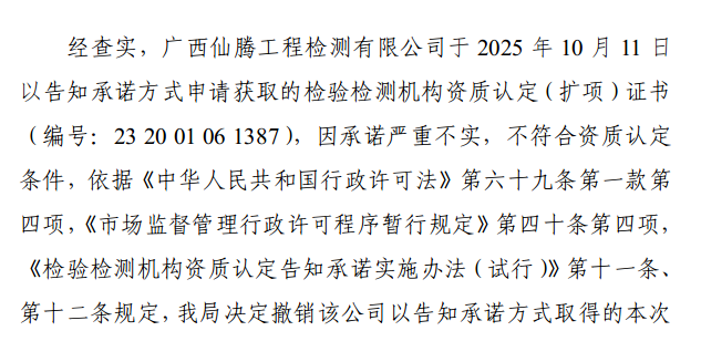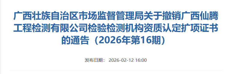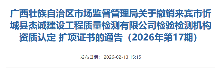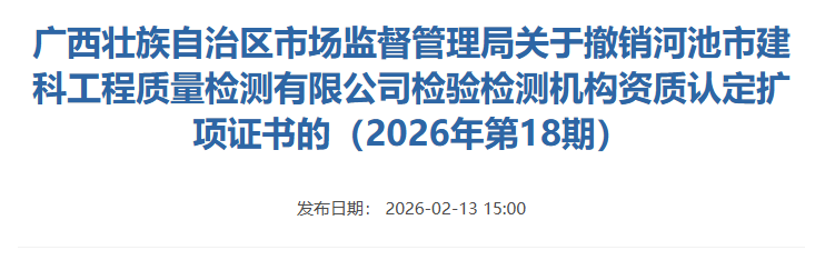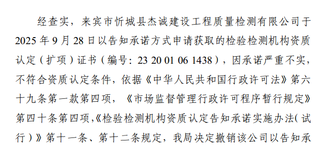 近期,内蒙古、广西市场监管部门通告,撤销4家检测机构资质认定证书,详情如下: