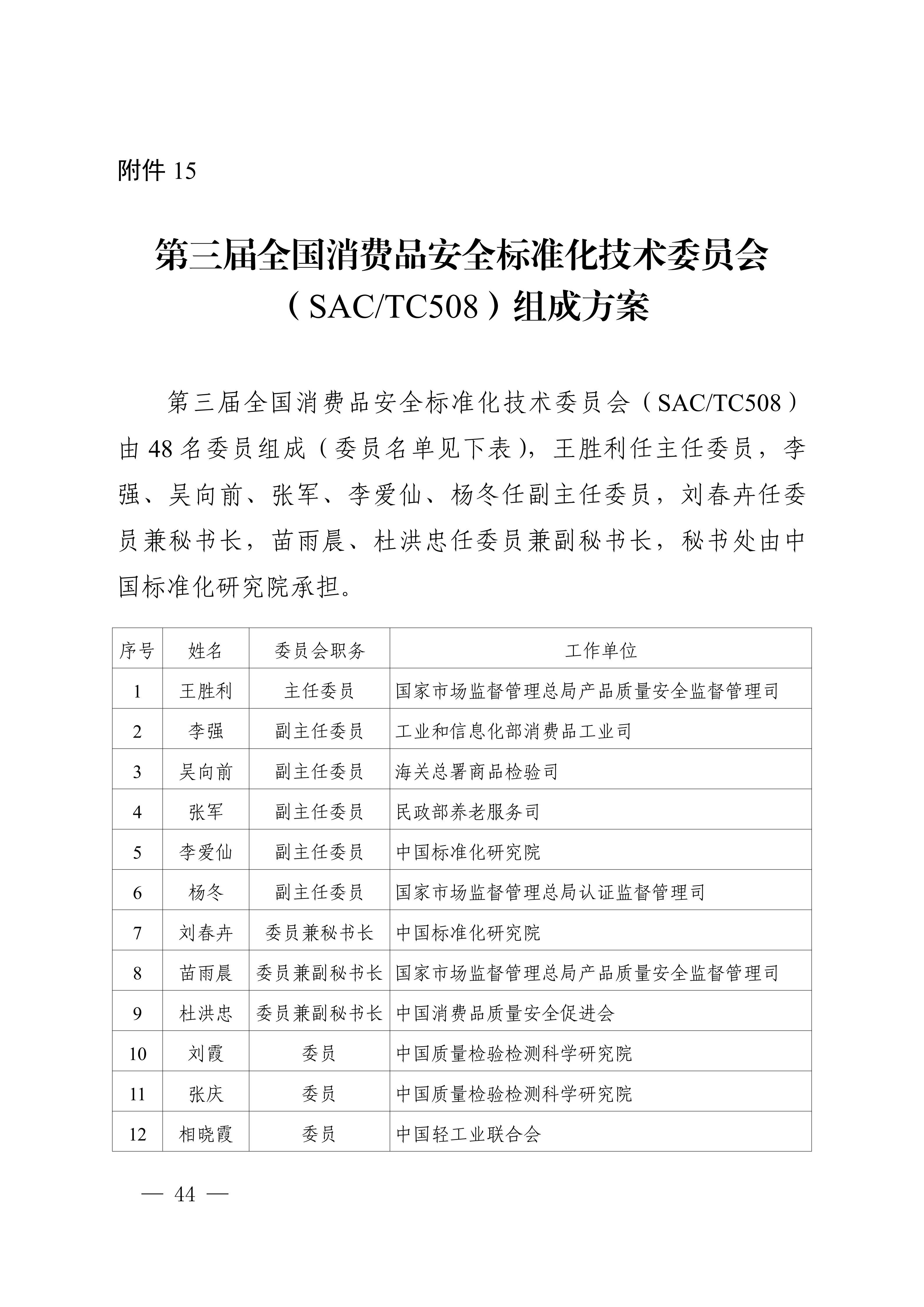 15.第三届全国消费品安全标准化技术委员会(SAC/TC508)组成方案