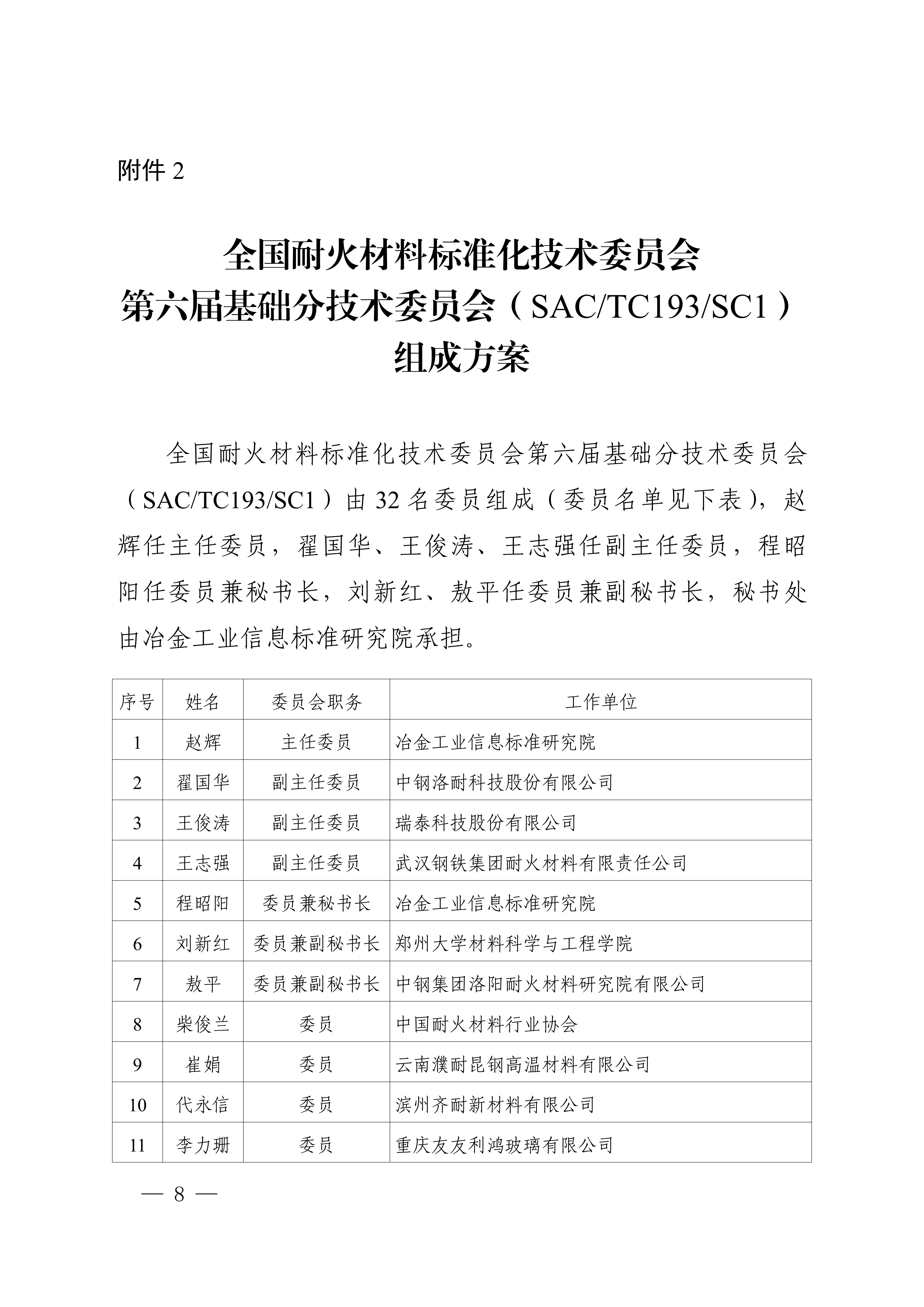 2.全国耐火材料标准化技术委员会第六届基础分技术委员会(SAC/TC193/SC1)组成方案