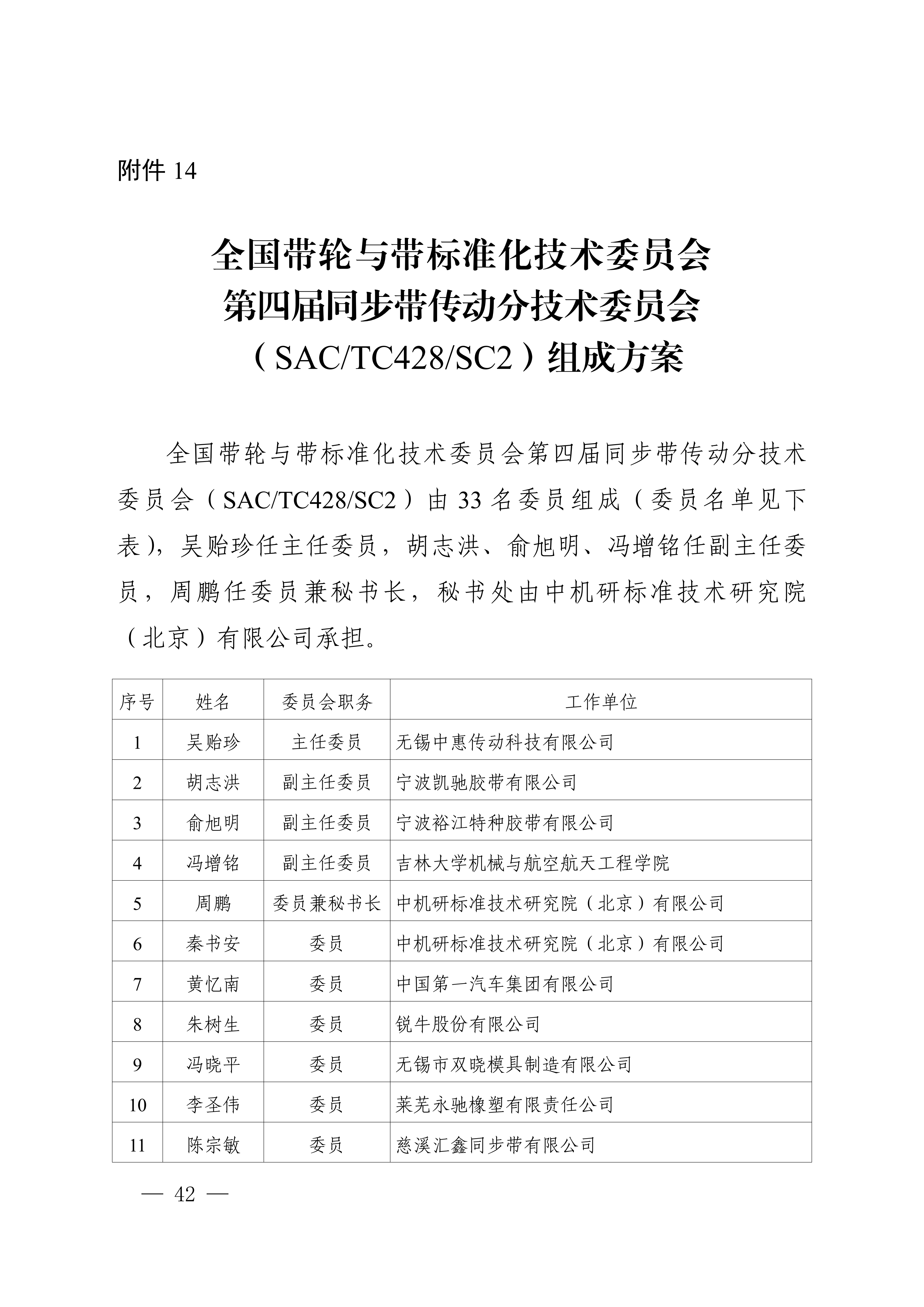 14.全国带轮与带标准化技术委员会第四届同步带传动分技术委员会(SAC/TC428/SC2)组成方案