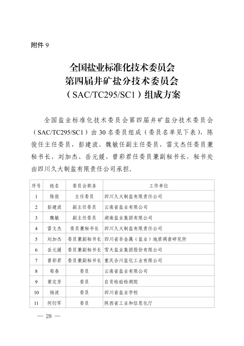 9.全国盐业标准化技术委员会第四届井矿盐分技术委员会(SAC/TC295/SC1)组成方案