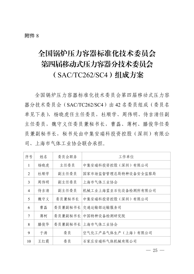 8.全国锅炉压力容器标准化技术委员会第四届移动式压力容器分技术委员会(SAC/TC262/SC4)组成方案