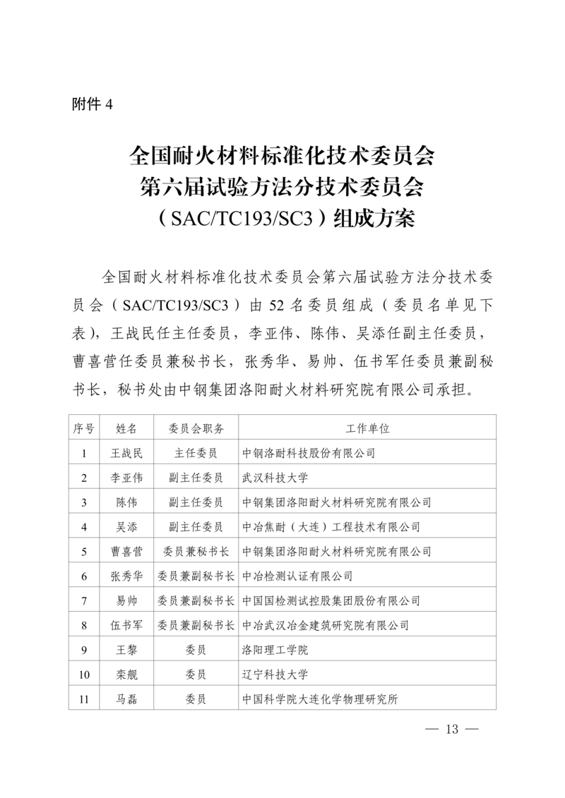 4.全国耐火材料标准化技术委员会第六届试验方法分技术委员会(SAC/TC193/SC3)组成方案