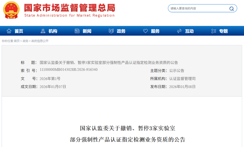 国家认监委关于撤销、暂停3家实验室部分强制性产品