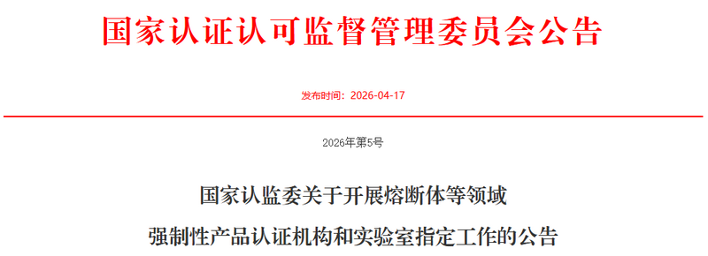 为落实《市场监管总局关于调整强制性产品认证目录内部分产品认证模式的公告》(2025年第57号)有关要求,国家认监委决定在熔断体等领域开展强制性产品认证机构和实验室指定工作。现就有关事项公告如下: