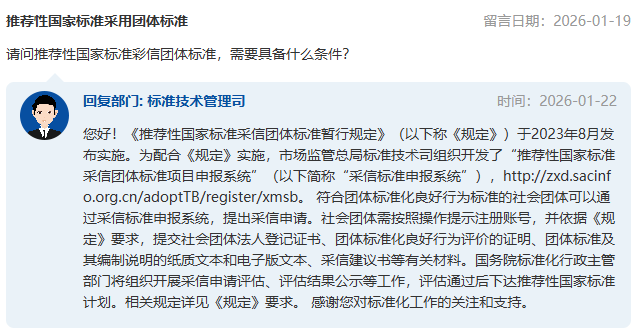 近期,有网友在市场监管总局网站公众留言系统咨询关于“国家标准引用、采用团体标准”的问题,市场监管总局给予了答复。