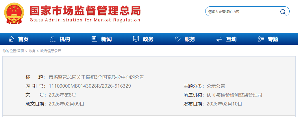 2月10日,市场监管总局发布公告,决定撤销国家大中型电机产品质量检验检测中心、国家加工食品及食品添加剂质量检验检测中心、国家家用杀虫用品质量检验检测中心等3个国家质检中心。
