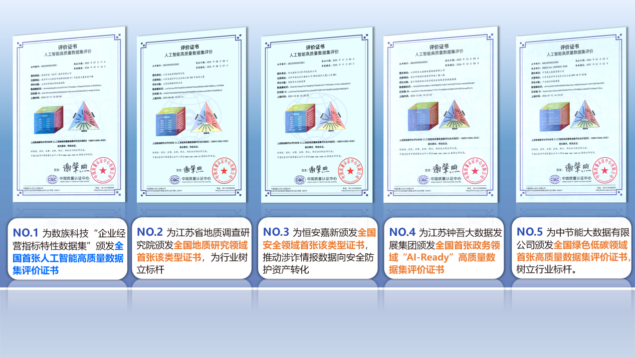 本业务有力推动数据要素的合规流通与价值释放,为人工智能产业的高质量发展提供坚实的数据质量支撑,促使认证认可服务向数据要素领域深入拓展,具备显著的行业引领价值。自业务落地实施以来,已为数族科技、江苏省地质调查研究院、恒安嘉新、江苏钟吾大数据、中节能大数据等多家重点机构提供专业评价服务,成功颁发全国首张以及多领域首张评价证书,获得市场与政府部门的认可,并荣获认证认可检验检测行业2025年度风云榜创新业务称号,成为数据要素与人工智能融合领域的标杆性服务。