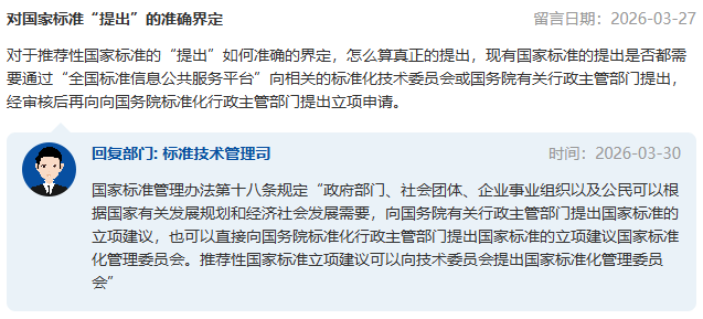 近期,有网友在市场监管总局网站公众留言系统咨询关于“国家标准立项建议”的问题,市场监管总局给予了答复。