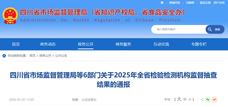 四川省市场监督管理局等6部门关于2025年全省检验检测机构监督抽查结果的通报