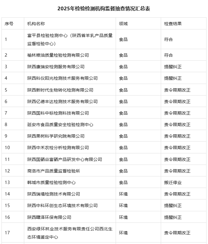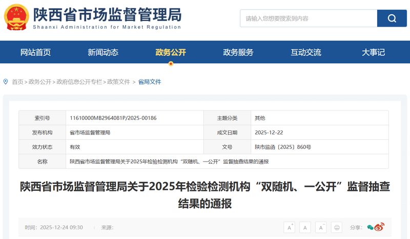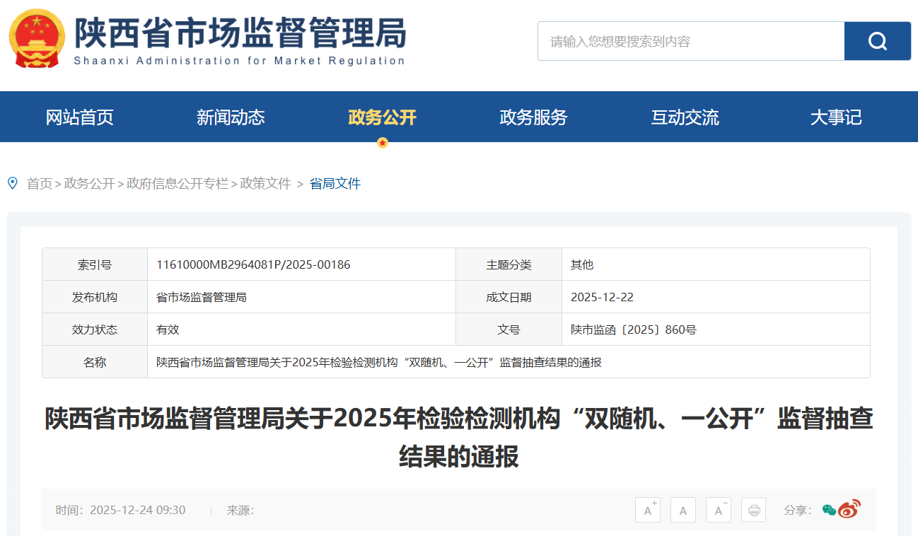 陕西省市场监督管理局关于2025年检验检测机构“双随机、一公开”监督抽查结果的通报